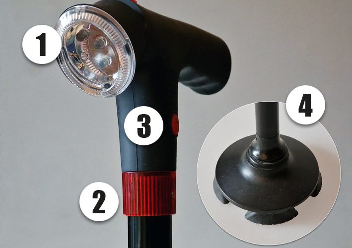 - Die Gehstöcke verfügen im Griff über eine batteriegespeiste LED-Lampe (1), die den Weg vor den Füßen ausleuchtet.