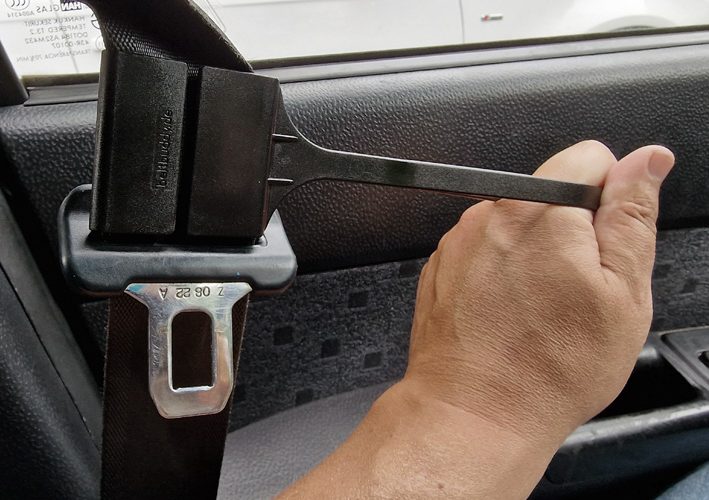 - Bei zweitürigen Pkw liegen die Gurte konstruktionsbedingt weiter hinten und sind schwerer zu fassen – hier ist die Angurthilfe besonders nützlich.