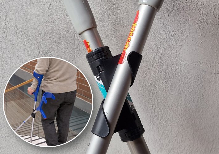 - Der XCLIP-Gehstützenhalter hilft Menschen, die zwei Unterarmstützen benötigen.